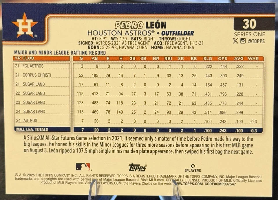 Houston Astros 2025 Topps Series 1 Pedro Leon #30 Rainbow Foil RC