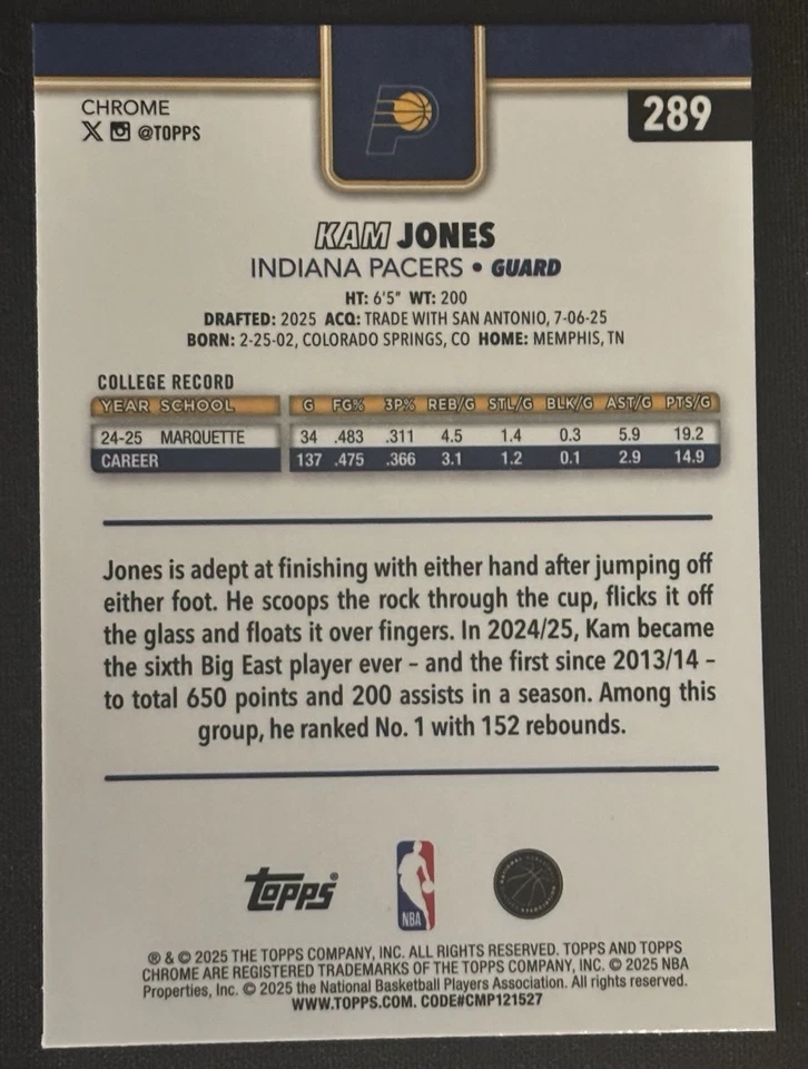 2025-26 Topps Chrome Sapphire - Kam Jones Blue Refractor #289 (RC)
