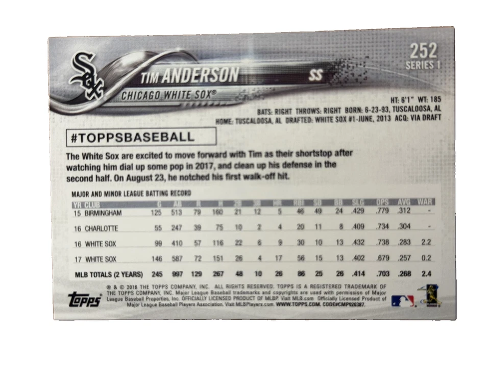 Excellent: 2018 topps Tim Anderson Chicago White Sox Trading Card