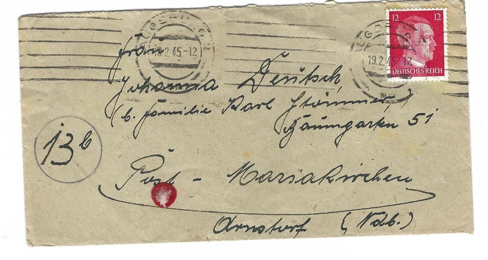 GERMANY LATE FRANKING COVER FEB 1945 POSTMARKS AUGSBERG
