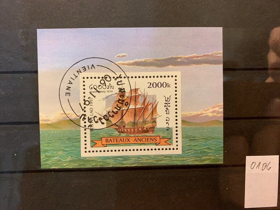 Stamps, Laos, Sailing Ship, 1997, Block, Stamped on Stock Card