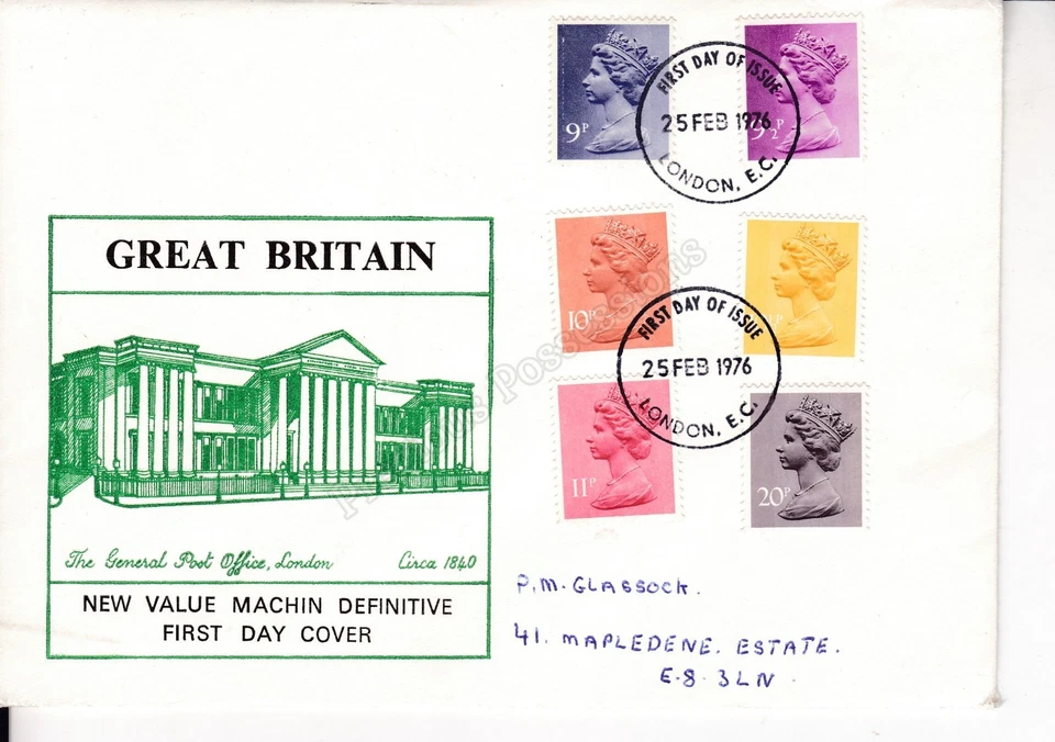 GB FDC FIRST DAY COVER 1976 NEW VALUE MACHIN DEFINITIVE STAMPS LONDON 9p-20p