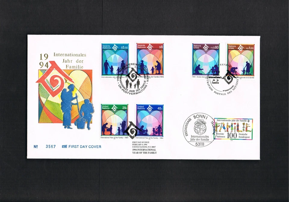 UN Trio FDC Mi.No. 160-161 + 243-244 + 661-662 + West Germany 1711 "Year of the Family"