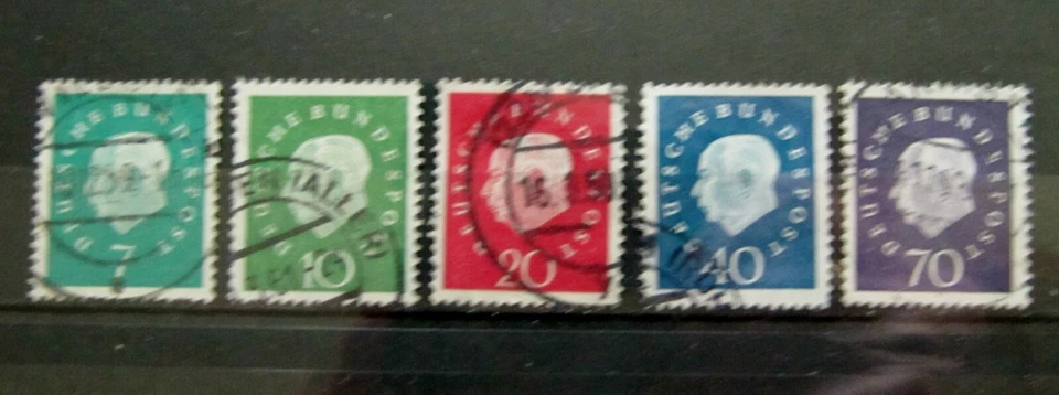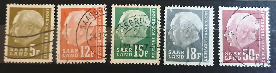 5 Briefmarken Saarland Deutsche Bundespost, Theodor Heuss, Franc, gestempelt