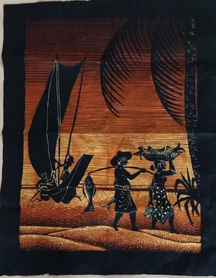 Batikbild, Motiv: Segelboot mit Fischern, gold-braun-schwarz