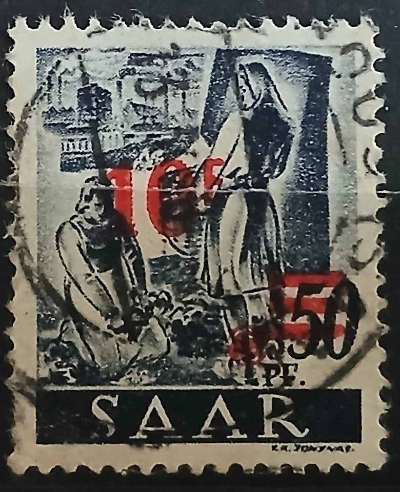 Briefmarke Saar 50 Pfennig mit Wertaufdruck in Franc, gestempelt