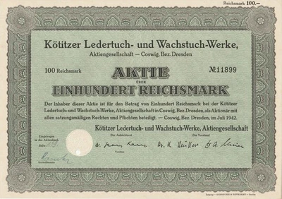 Aktie Kötitzer Ledertuch-und Wachstuch Werke AG Coswig 1942 über 100 Reichsmark