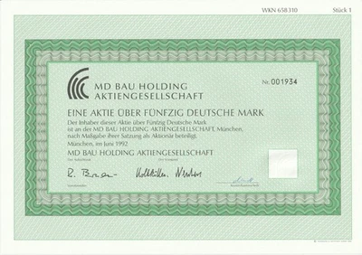 Aktie MD BAU HOLDING München 1992 über 50 Deutsche Mark Wertpapier