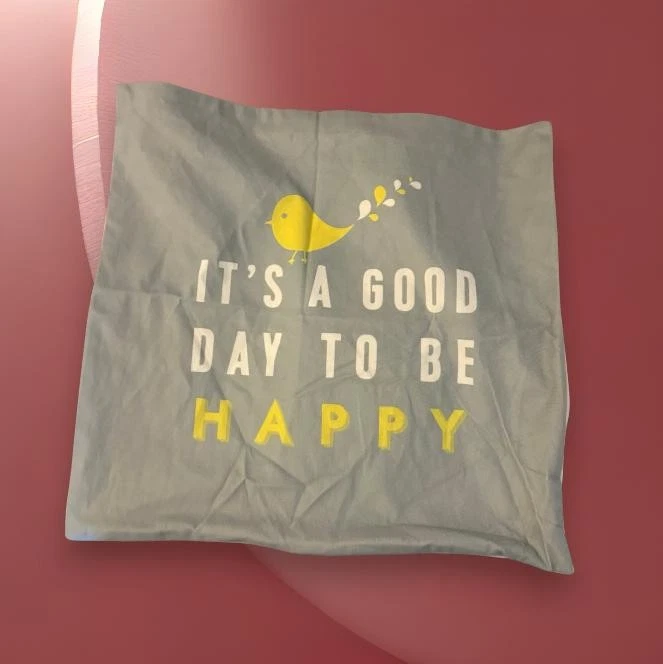 Kissenhülle 45x43 grau gelb weiß Vogel "It's A Good Day To Be Happy"