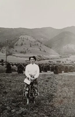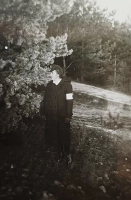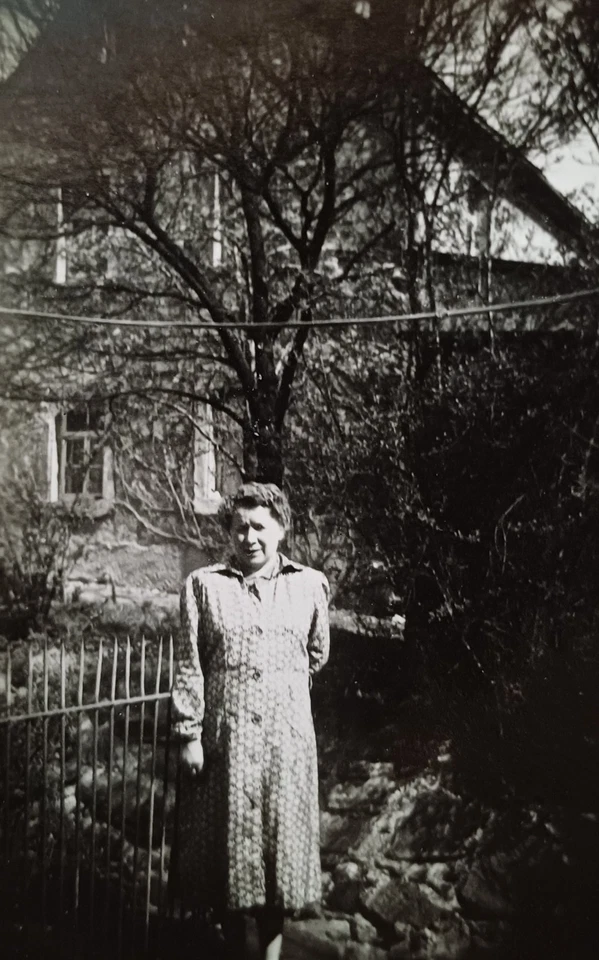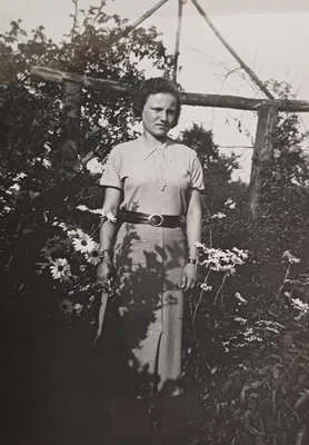 Frau in eleganter Jacke steht im Garten in Hüttenfeld 1937 Foto