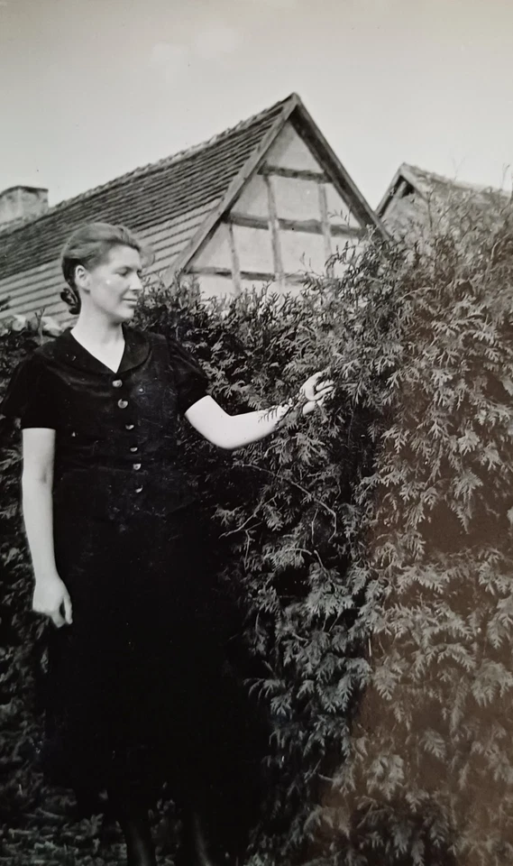 Junge Frau steht verträumt mit der Hecke spielend Bauernhaus Kamenz 1909 Foto