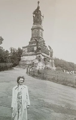 Schöne junge Frau steht im Sommermantel vor Niederwalddenkmal Rüdesheim Foto