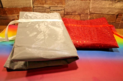 Geschenkbeutel aus Stoff 2 Stück grau = 50 x 48 cm, rot = 47 x 33 cm, neutral