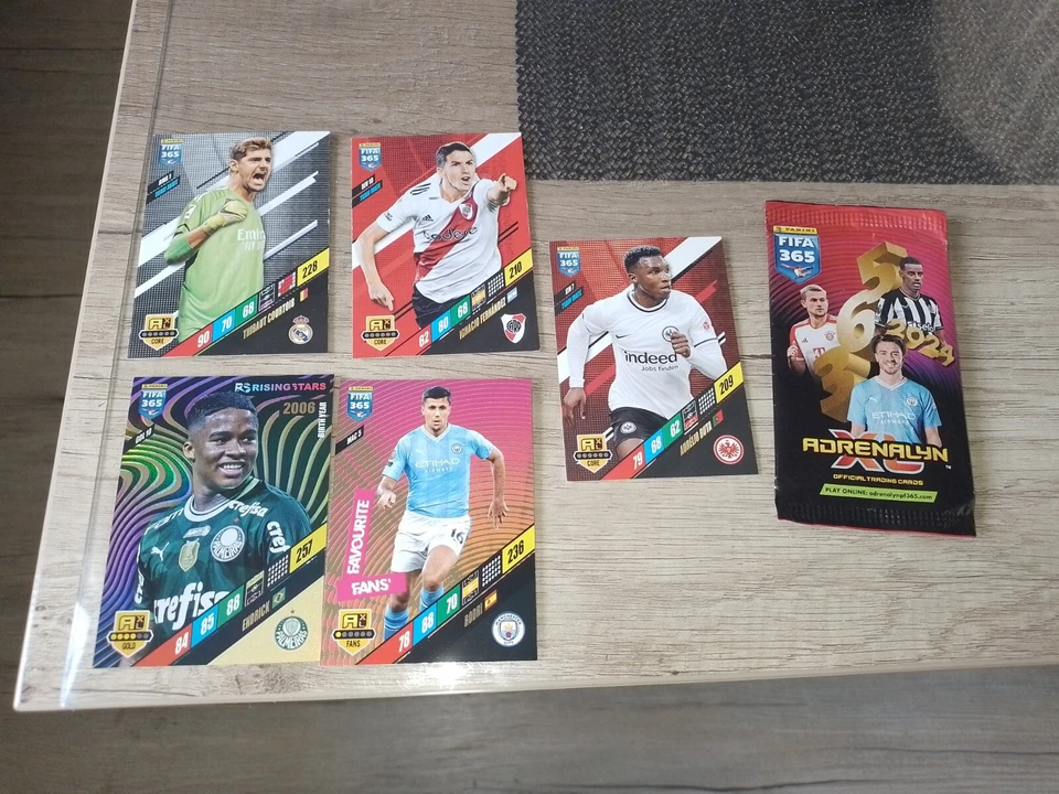 Panini Fifa 365 2024 Adrenalyn 5 Karten und eine leere Packung Cards Endrick