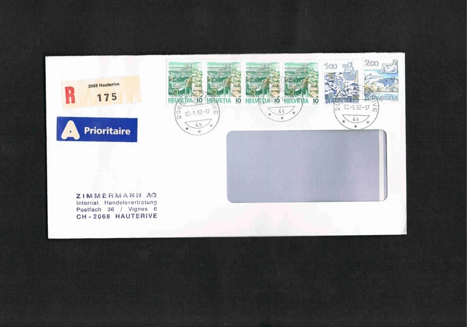 Schweiz-Bedarfs-Beleg-EINSCHREIBEN " 10.1.92 Hauterive " echt gelaufen