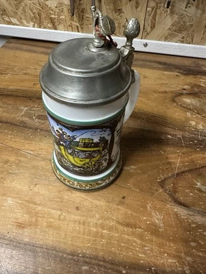 Alter toller Porzellan Krug Humpen Bierkrug mit Zinndeckel Postmotiv