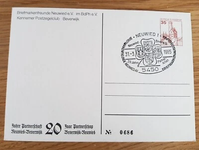 Ganzsache 20 Jahre Partnerschaft Neuwied Beverwijk 1985 Sonderstempel