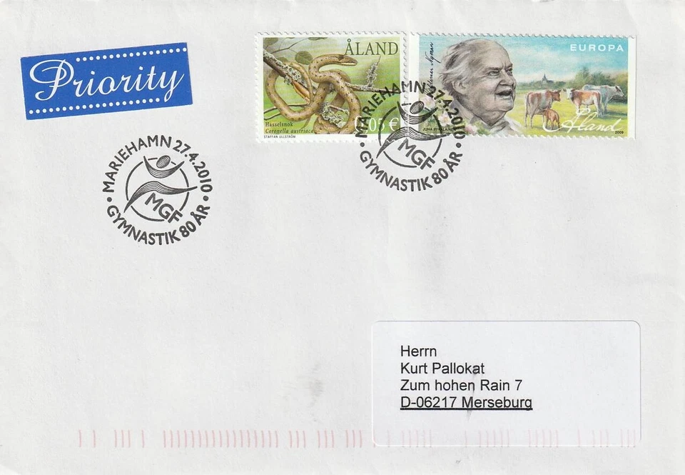1690 // Nr. 199, 308 auf Brief aus Mariehamn von 2010 - SST 80 J. MGF Gymnastik