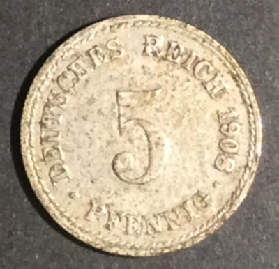 Münze Deutsches Reich 5 Pfennig 1908, Prägestätte A, Cu-Ni