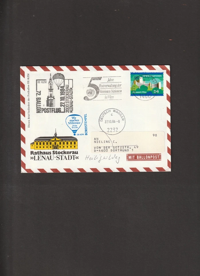 UNO-Wien - 72. Sonderballonpostflug " OE-KZM Stockerau - LENAU-STADT 27.10.84 "