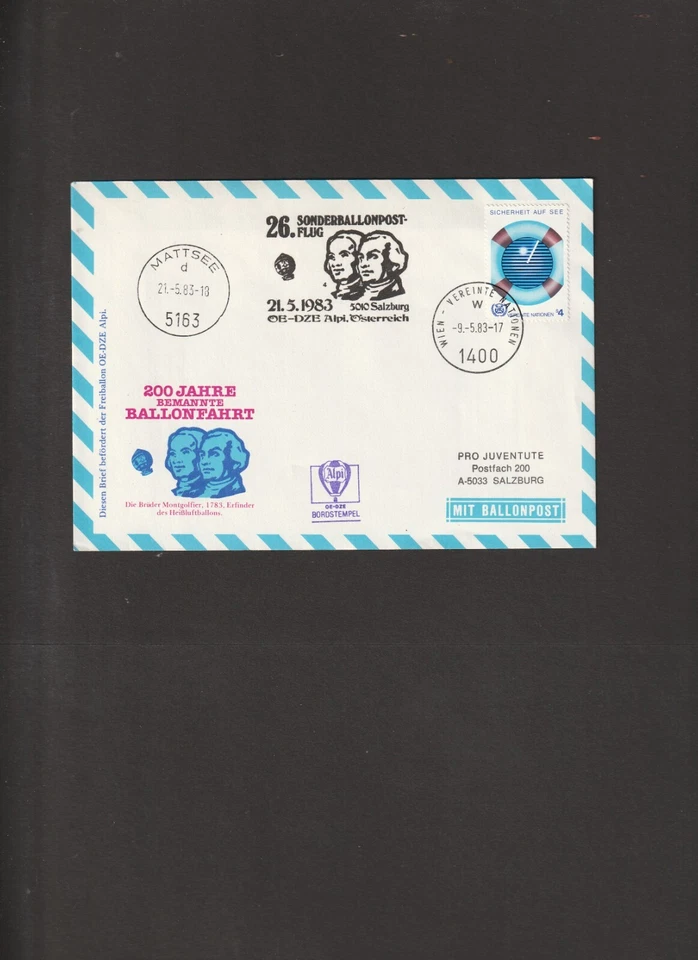 UNO-Wien - 26. Sonderballonpostflug " OE-DZE Alpi 21.5.1983 Salzburg-Mattsee "