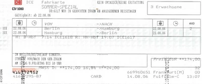 Fahrschein: Hin- und Rückfahrt Berlin - Hamburg von 2006 der Deutschen Bahn