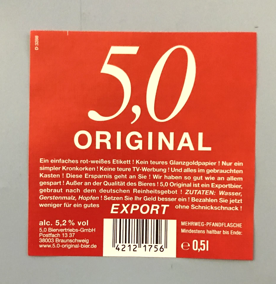 Bieretikett , 5,0 BIERVERTRIEBS GMBH Braunschweig / Niedersachsen #1019#
