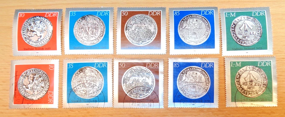 DDR 1986 2 X MARKENSATZ HISTORISCHE MÜNZEN/STÄDRETALER POSTFRISCH/GESTEMPELT