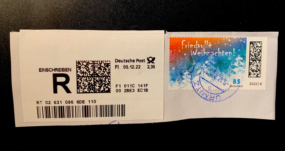 3728 BRD 2022 friedvolle Weihnachten 0,85€ Einschreiben gestempelt auf Papier