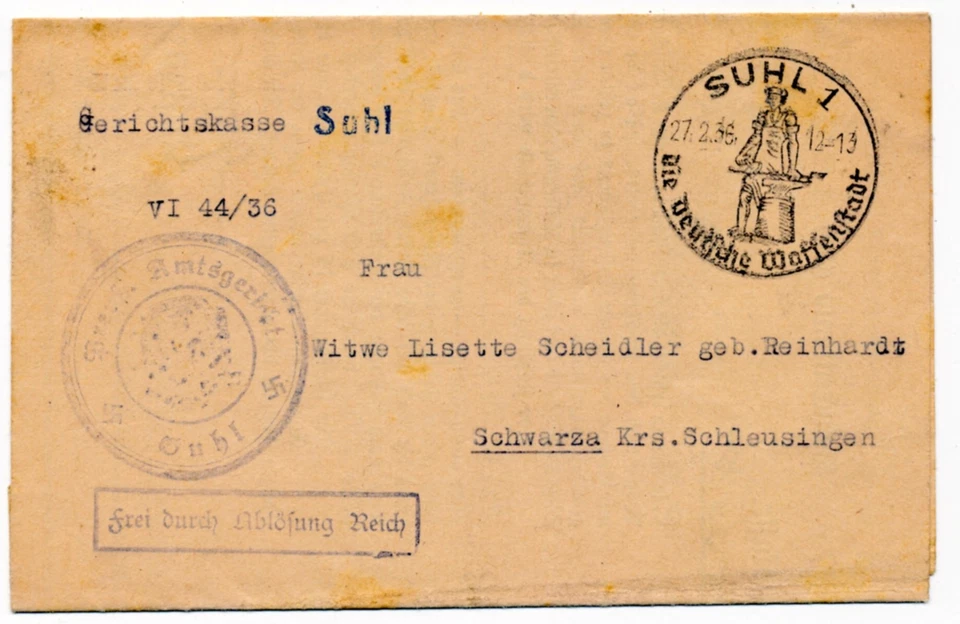 Deutsches Reich 1936 Sonderstempel / Frei durch Ablö. -Suhl 27.2.36 Waffenschmid