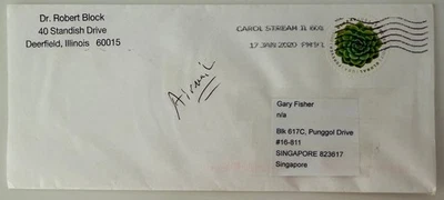 USA 2020 Cover to S'pore cw 2017 Floral circular stamp. Used.