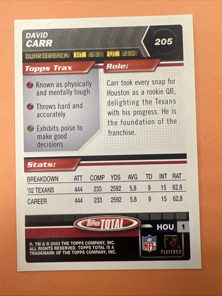 2003 Topps Total Football - DAVID CARR #205 - Houston Texans
