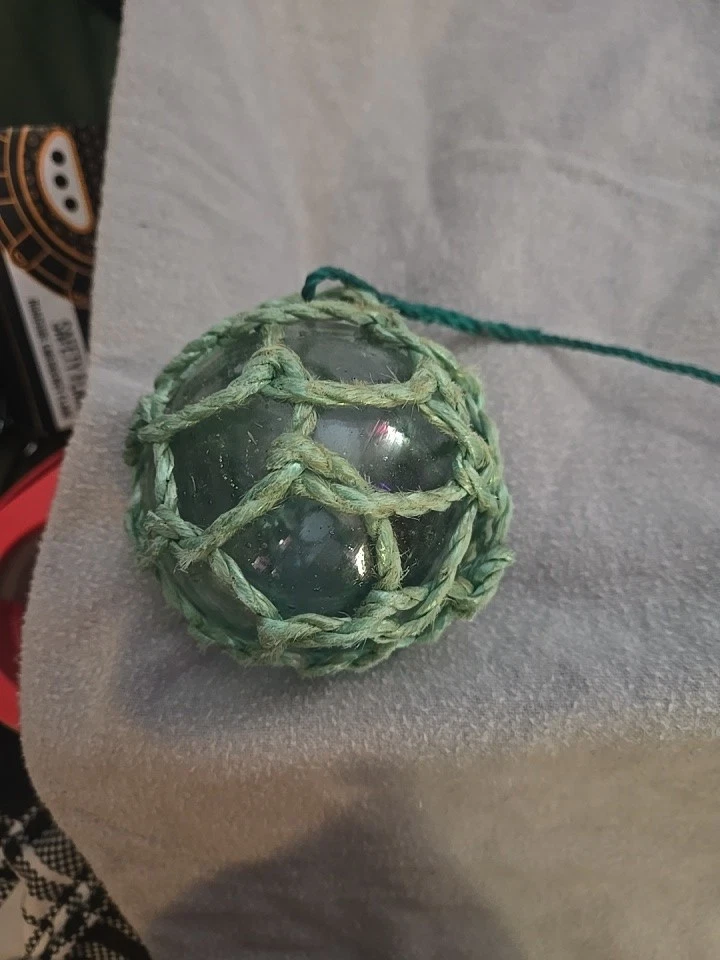 Japanese Glass Fishing Float Ukidama Buoy Ball Vtg Bindama Rope Small Blue GF26