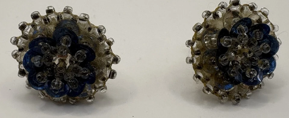 1950s Blue Beaded Flower Clip-On Earrings - Retro Costume Jewelry Sparkle