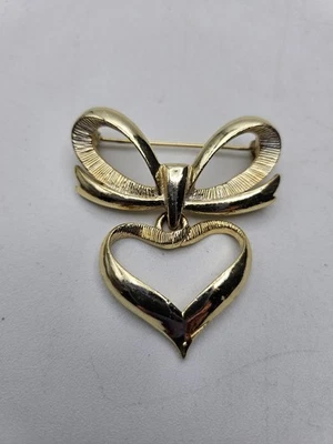Bow with Dangle Heart Brooch Gold Tone Pin Vintage Valentine Love