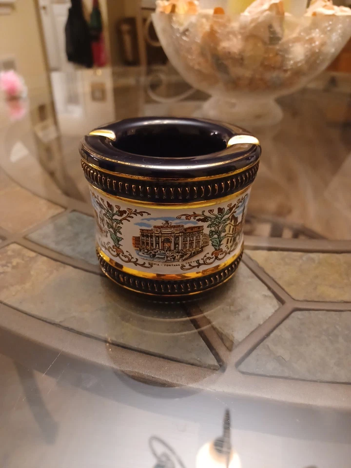 Florentine Souvenier Ashtray Black ~ Gold Trim ~ Rome Landmarks - ITALY