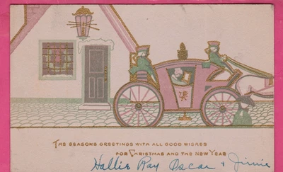 Vintage Christmas card/ NOT pc/carriage, lady inside reading/gold outlines/home