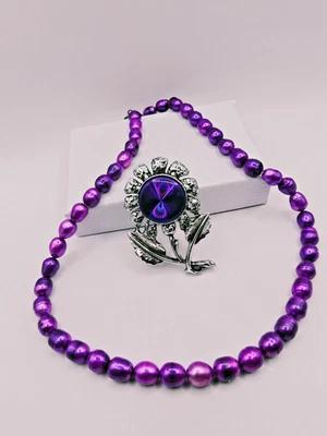 VTG, Brooch Pin Flower Silver tone Purple Holographic Refraction/Pearl Necklace