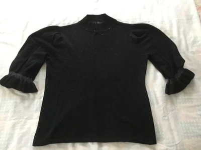 80 Park Woman's L Black Sweater Keyhole & Rhinestones 3/4 Puff Sleeves