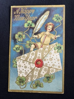 A Happy New Year - Boy Feather Letter Clover #404 - c1910s Embossed Postcard A&S