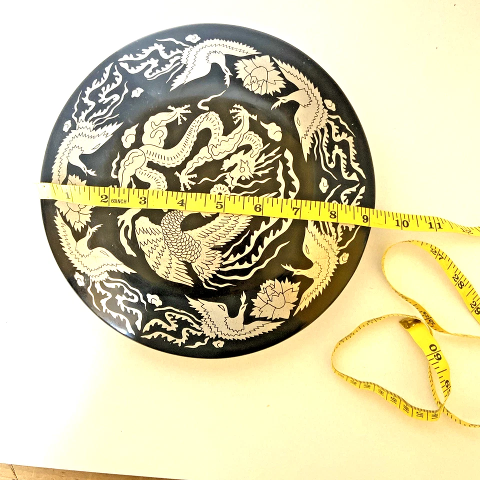 Black Lacquer Wooden Trinket Box 9" Round - Top Painted Silver w/birds dragons