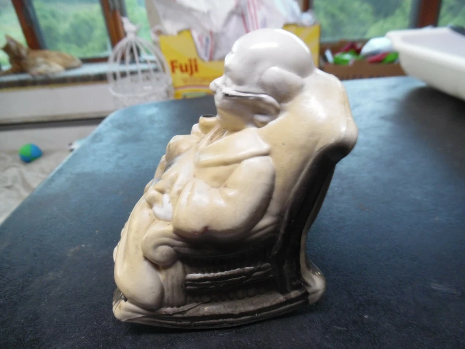 Vintage old man with dog on rocking chair plastic bank - 4"