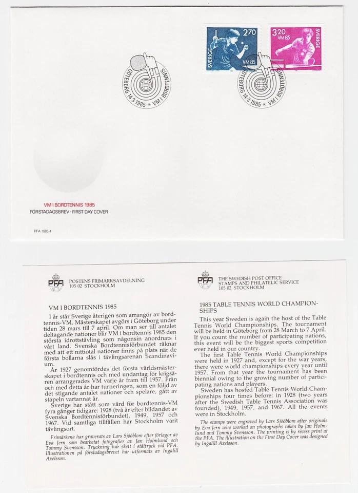 SWEDEN - SPORTS - WORLD CHAMPIONSHIP IN TABLE TENNIS 1985 + INFO SHEET