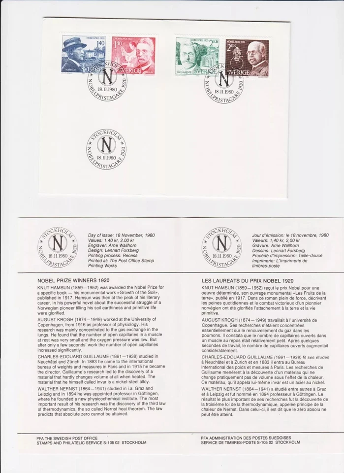 SWEDEN: NOBEL PRIZE - HAMSUN, KROGH, GUILLAUME, NERNST 1980 FDC + INFO SHEET