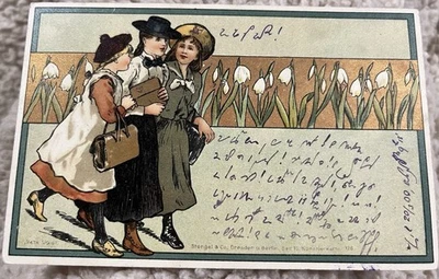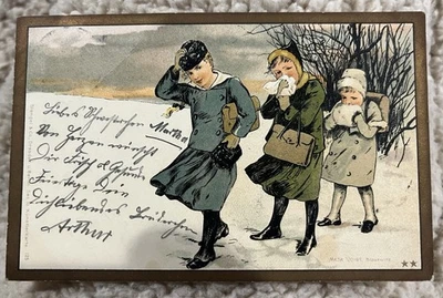 Early Vintage Postcard German C1900 Art Nouveau Children Winter Scene