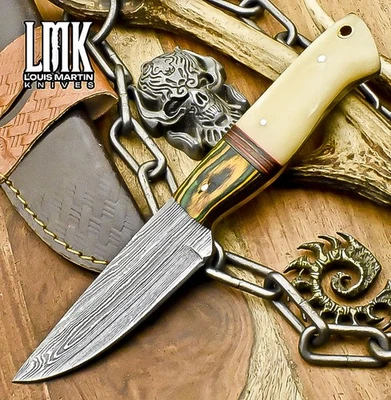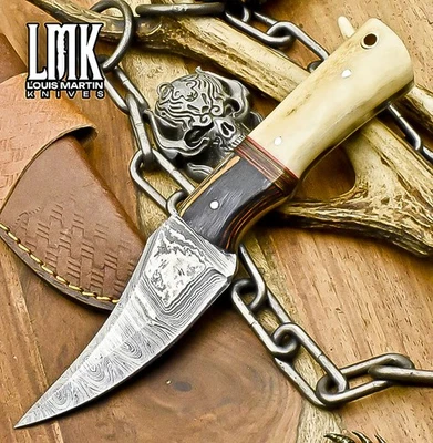 LMK Custom Skinner Knife Twist Damascus Bone Wooden Bolster Fishing Razor Sharp