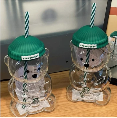 Starbucks Green Hat Teddy Bear Glass Cold Cup Christmas Tumbler 20oz W/Gift Box