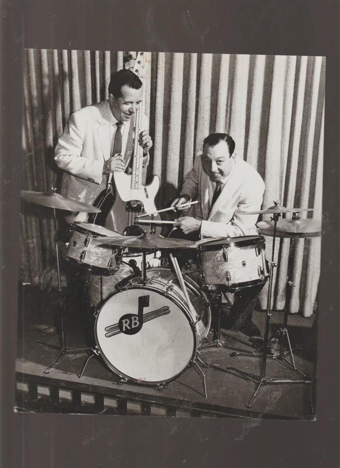 7 X 9 B&W PHOTO OF-SCENE-2 MEN - 1 PLAYING DRUMS