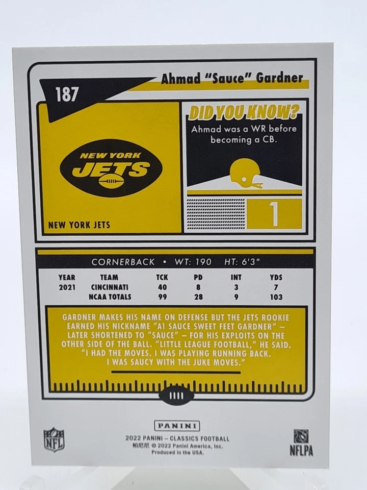 Ahmad 'Sauce' Gardner 2022 Panini Classics Rookie #187 NY Jets RC