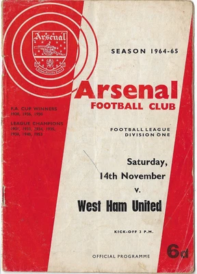 Arsenal v West Ham United 1964/65 Division One, match programme